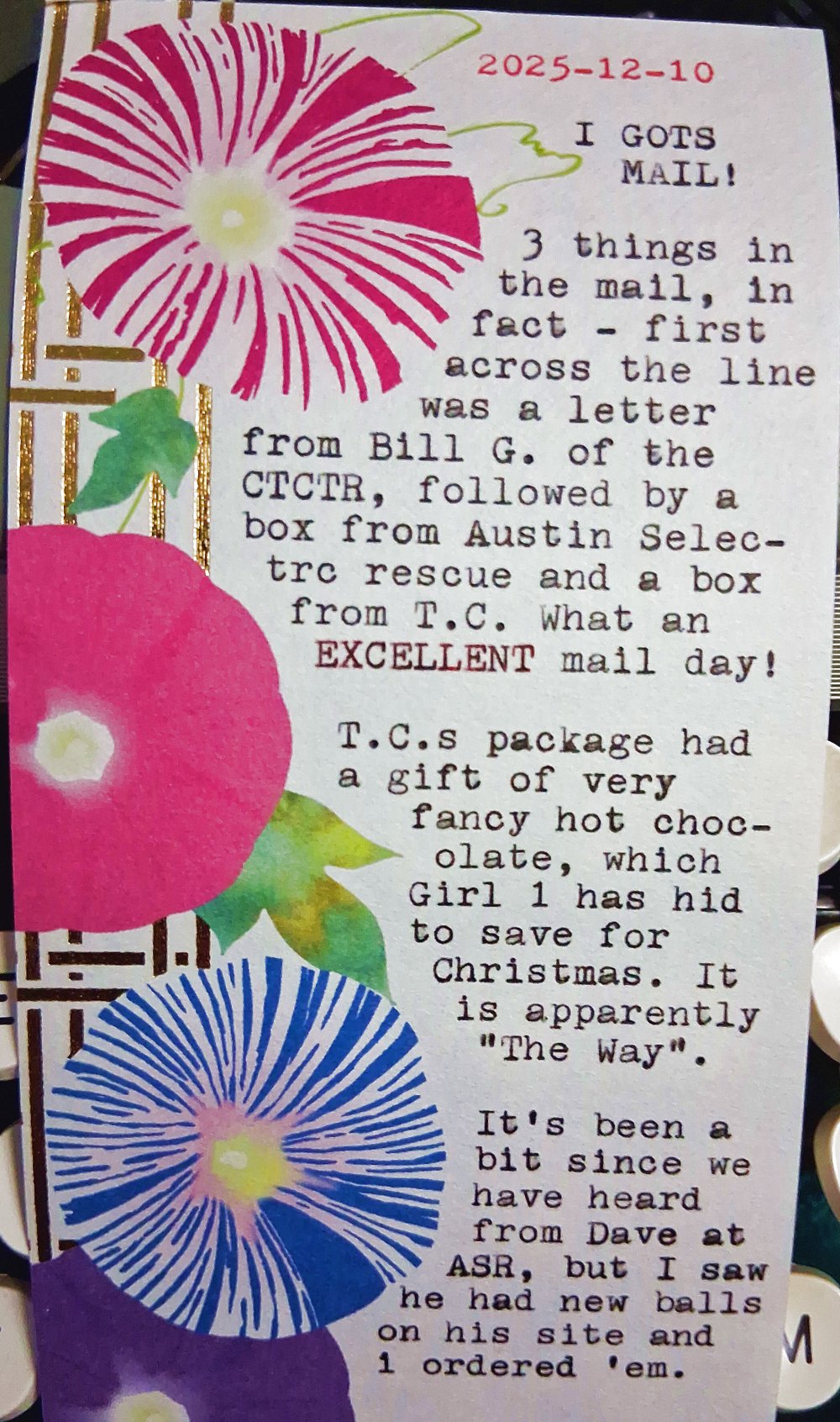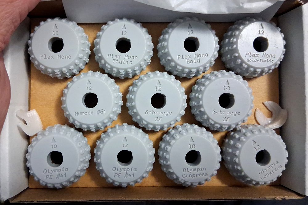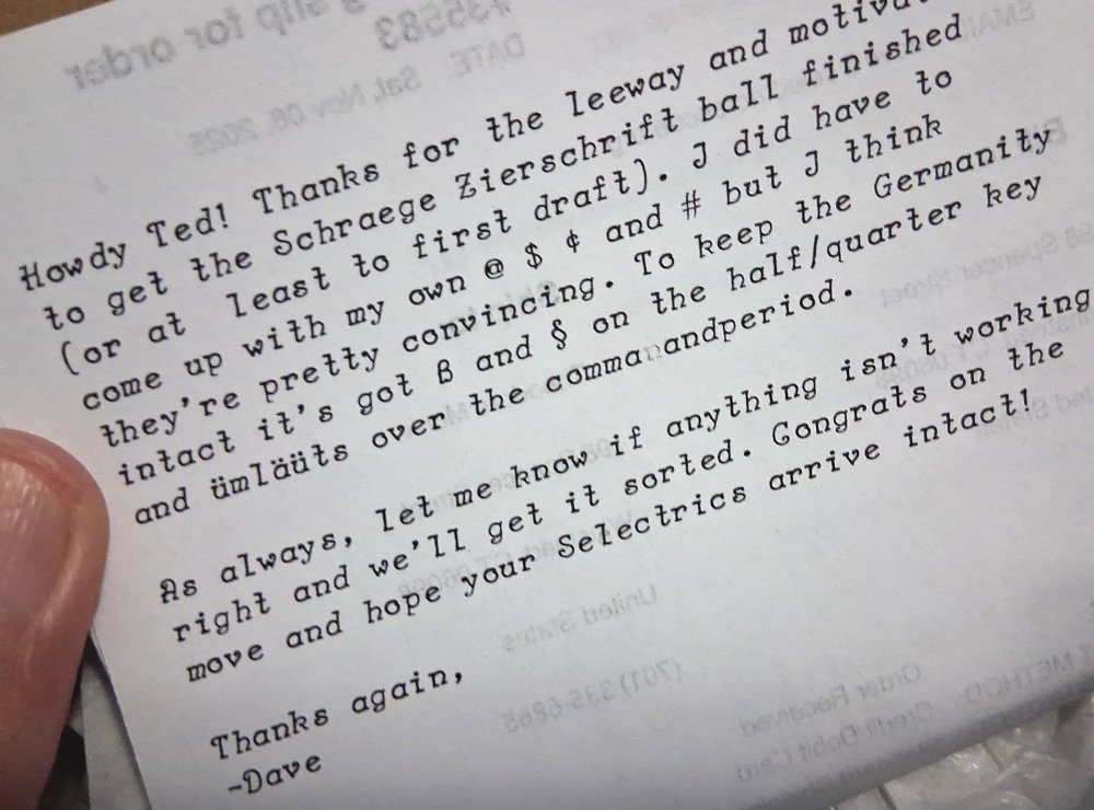 Let’s see, I picked up 4 styles of Plex Mono in 12 Pitch, Smith-Corona Numode #61 in 12 pitch, Olympia Professional Elite #41 in 12 and 10 pitch, Olympia Congress in 10 & 12 pitch, and a mystery typeface – not yet available from Dave’s site, but which you might consider asking about to see if it prompts him to offer even more exotic typefaces on Selectric typeballs soon.